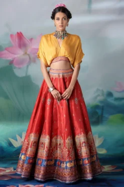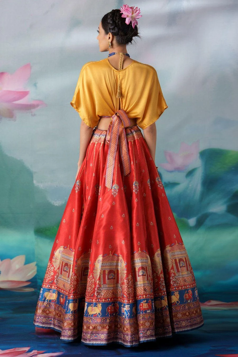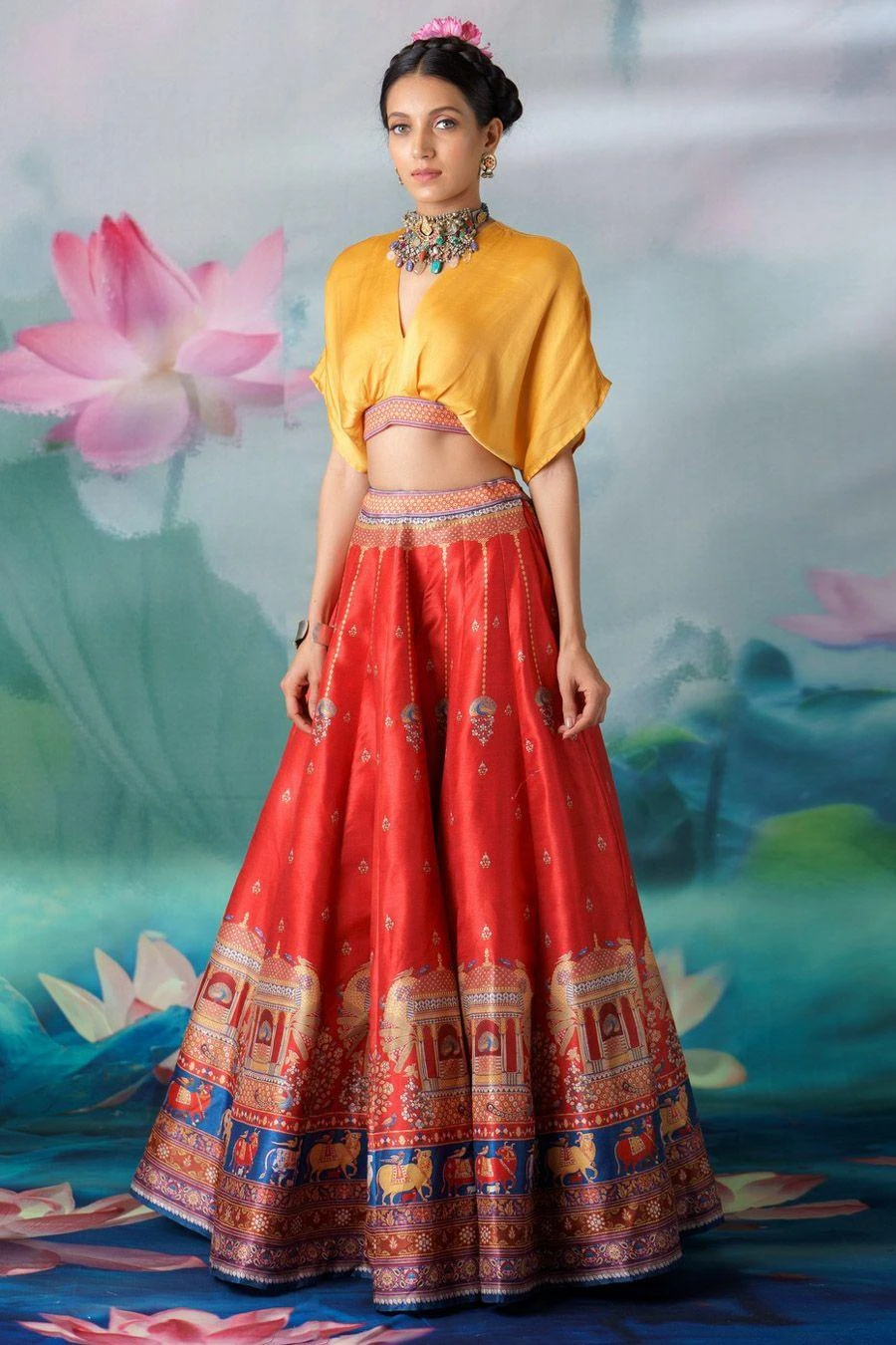 The perfect amalgamation of style and comfort, this lehenga set works across occasions. Crafted in satin & dupion, this set features a V-neck top with kaftan sleeves paired with a printed skirt. Add a pair of statement earrings to complete the look