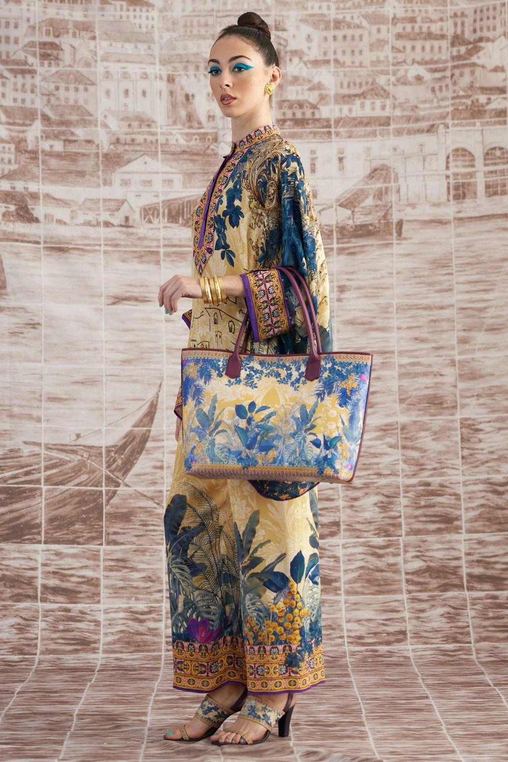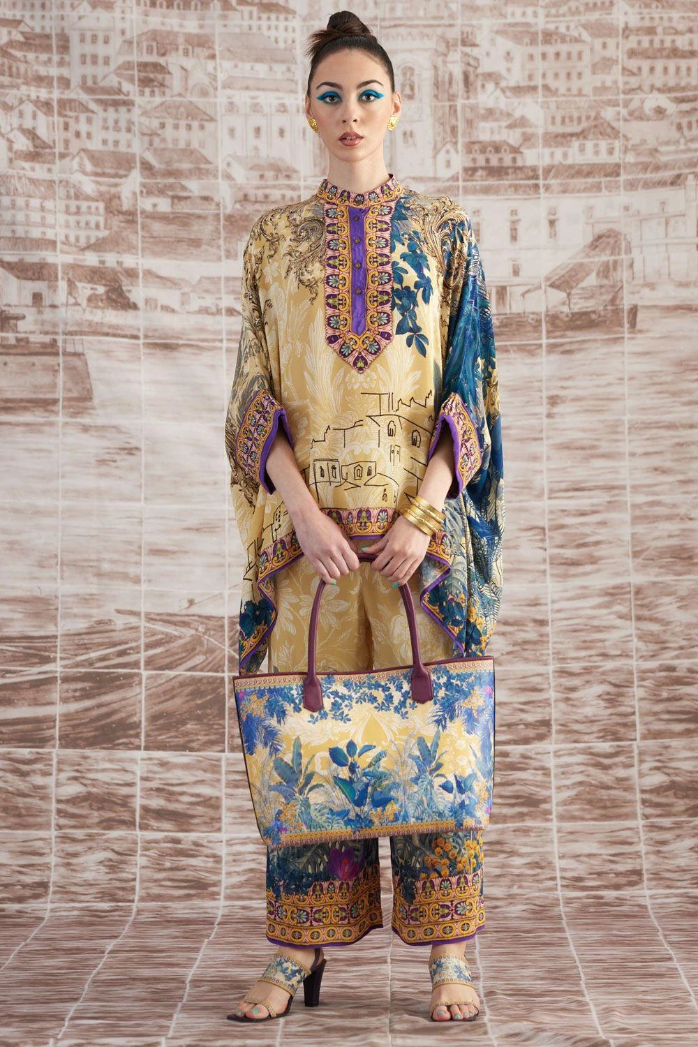 Crafted in silk, these blue pants feature a floral print all over. Pair these bottoms with the Blue Ramona V-neck floral poncho from the collection to complete the set.
