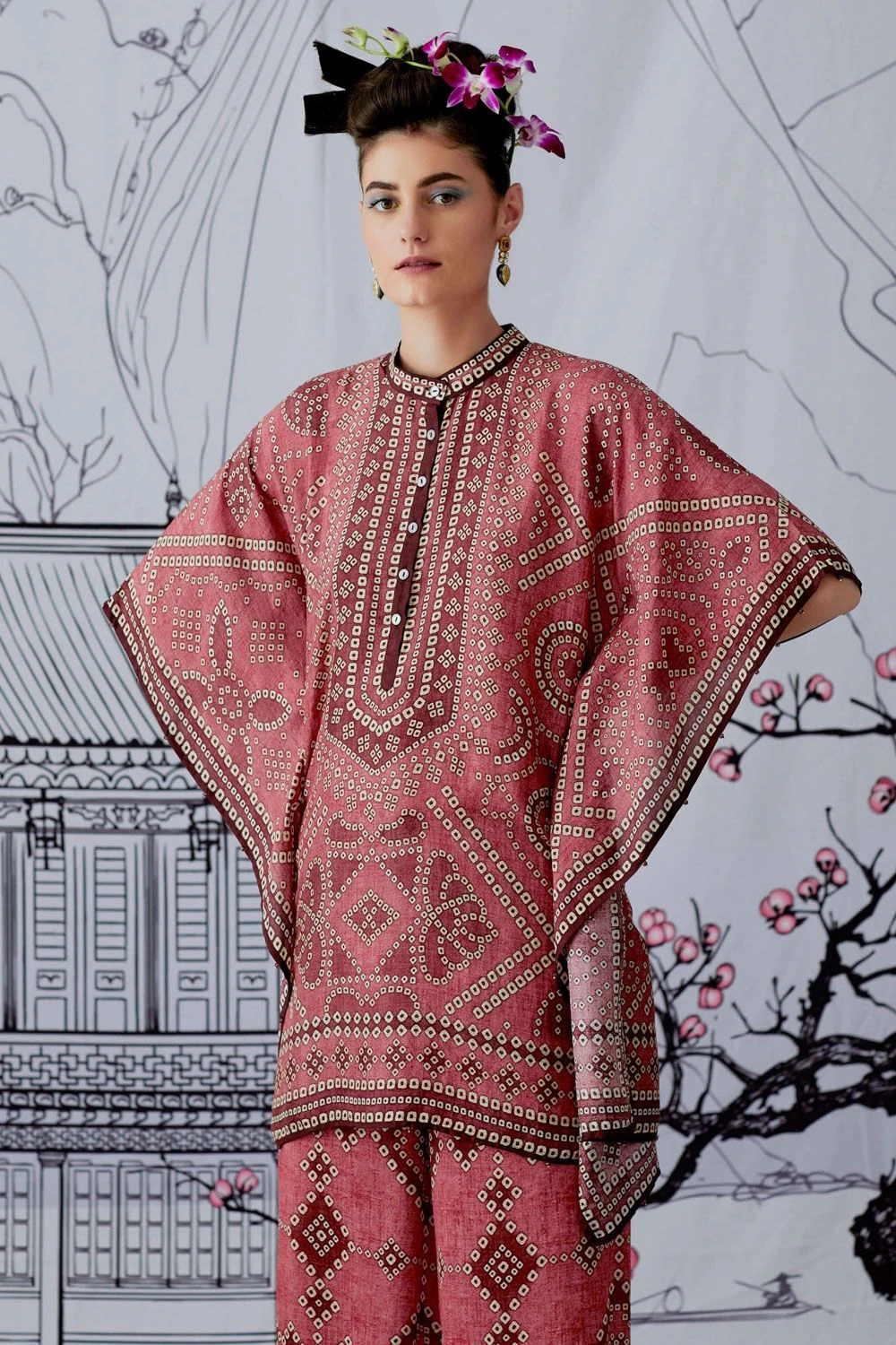 This square poncho tunic is perfect for casual daytime events. It is cut in a luxe bandhani printed silk fabric. Style it with the matching pants to complete your look.