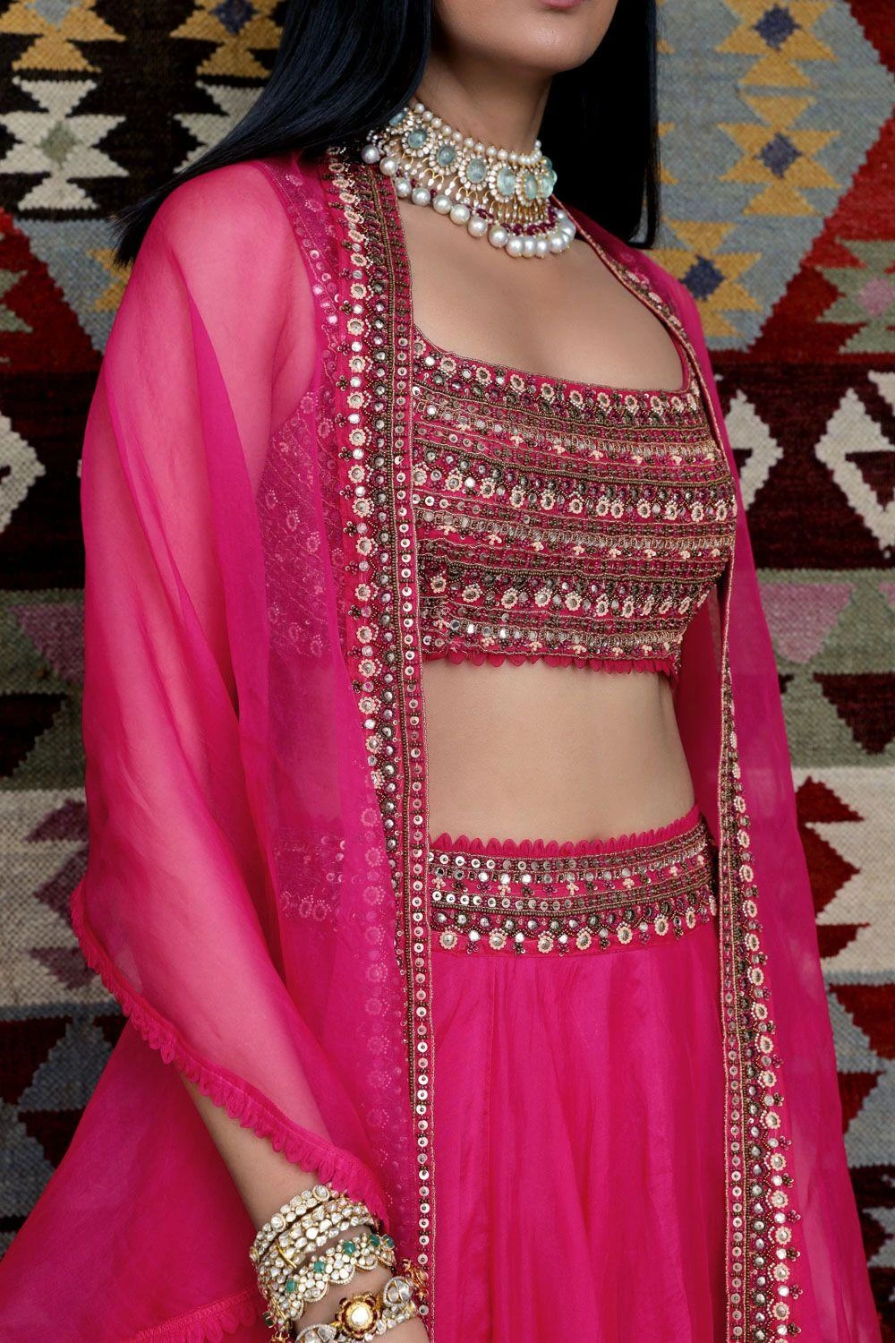Live your celebrations in style with this fuchsia lehenga set. It features an organza flared lehenga, paired with a multi-coloured blouse and an organza dupatta. You can adorn a polki necklace & earrings with this look.