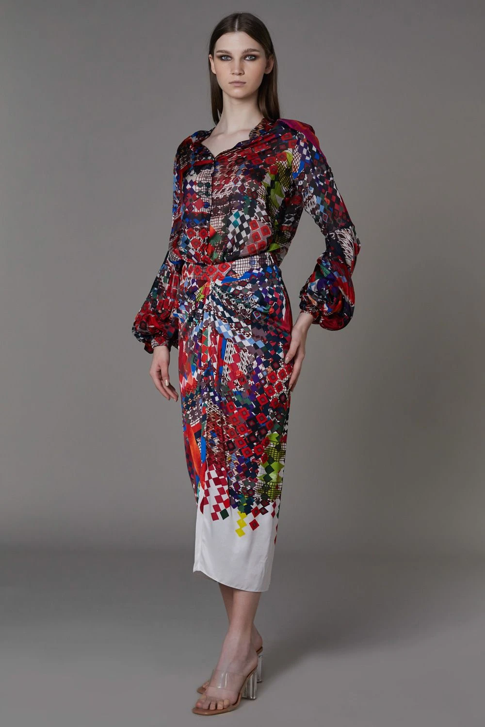 This statement abstract print pencil skirt is set in a luxe satin fabric. Style it with the matching top or a bustier for a playful daytime look.