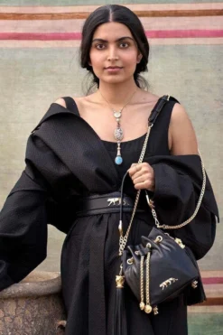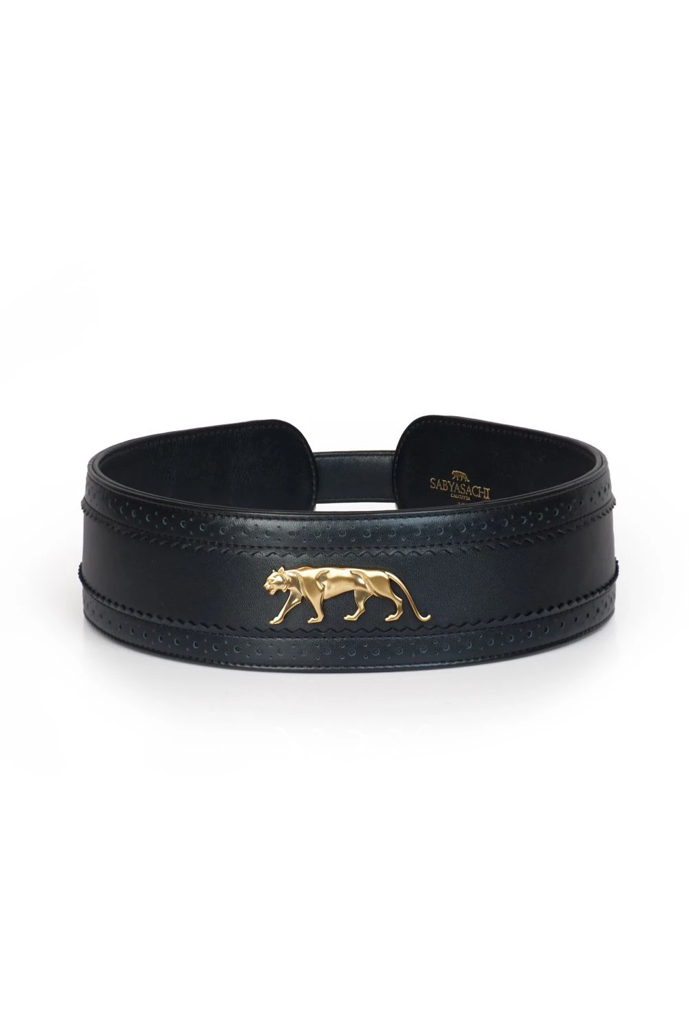 Add an essence of royalty to your looks with this wide black leather belt. It is crafted in fine leather and accentuated with Sabyasachi’s signature Royal Tiger logo plated in 24K gold. Cinch it over a sari or gown.