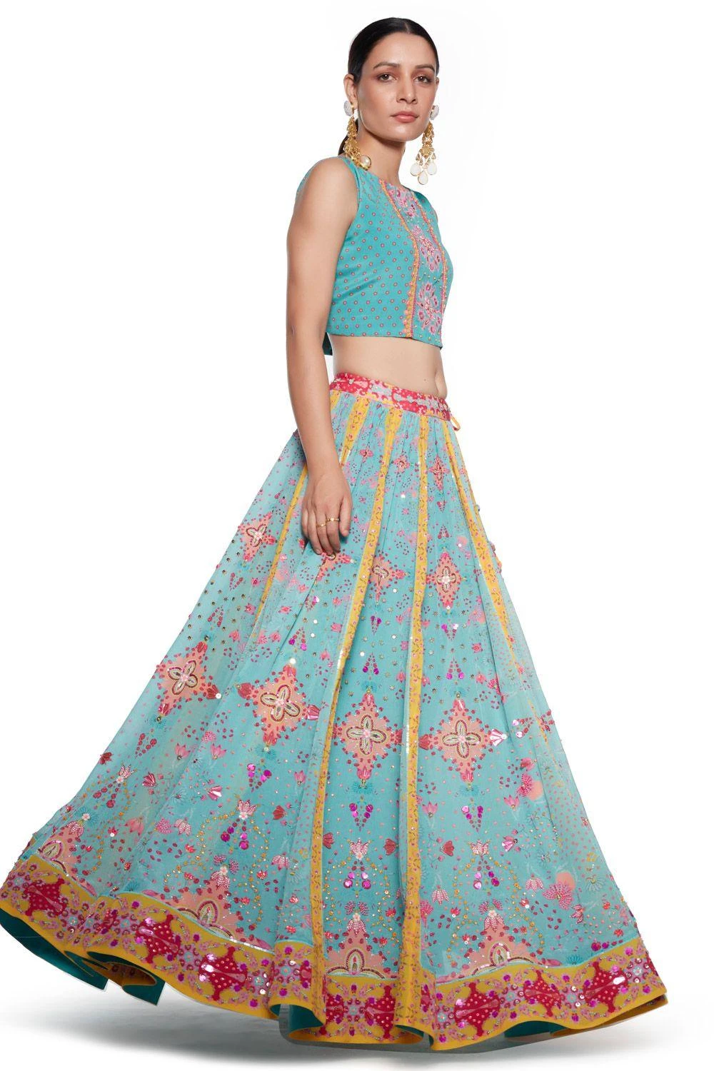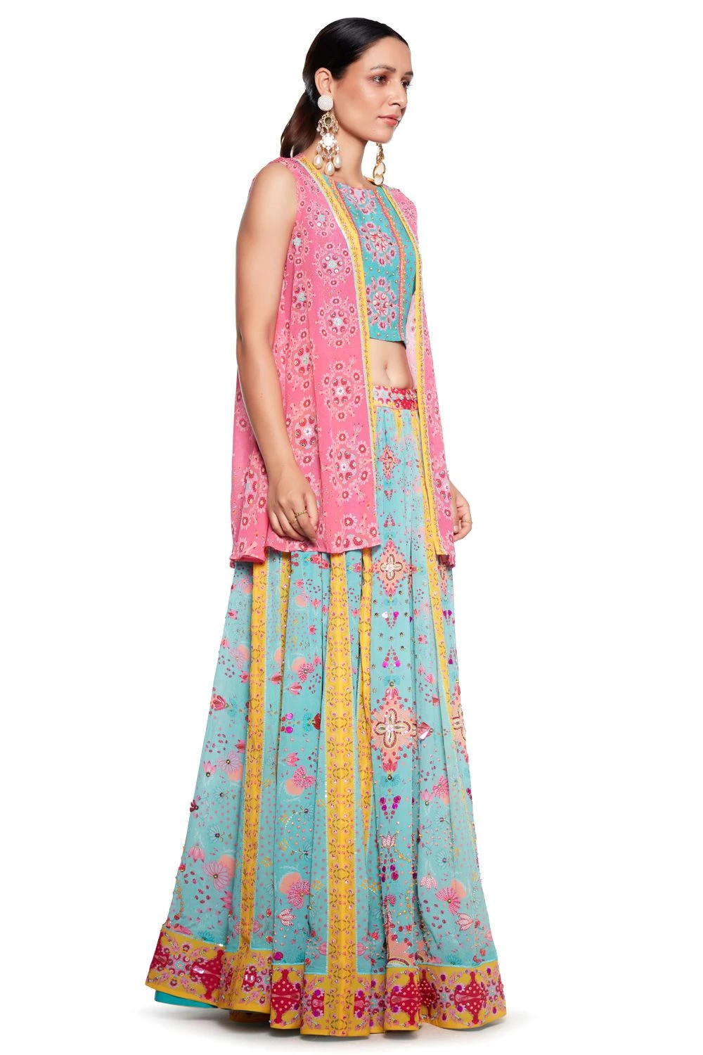Radiate absolute resplendence in this sky blue & pink floral lehenga set. It features a printed crepe lehenga accented with delicate embroidery. It is paired with a matching blouse and a tie-up overlay, topping off the look.