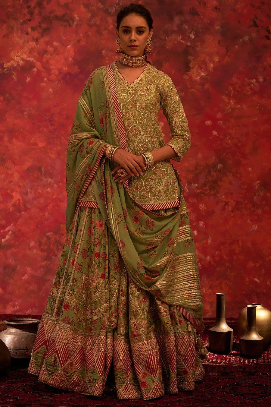 Add this ethereal ensemble to your wedding trousseau for an elegant bridal look. This set comes with a nakshi & gota patti embroidered short kurta with a similarly embellished lehenga & a dupatta complimented with handmade tassels.