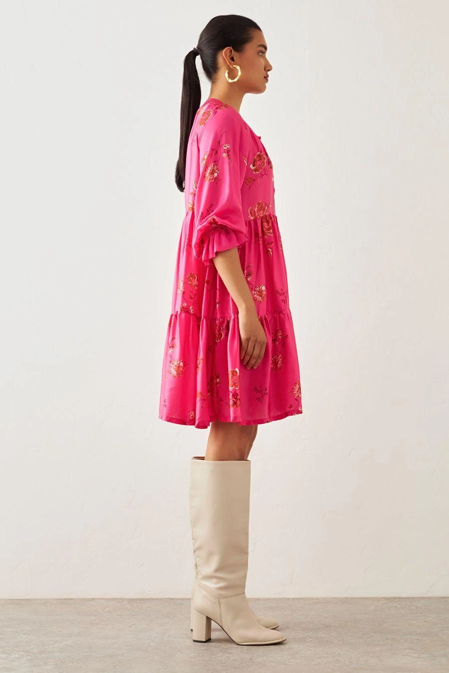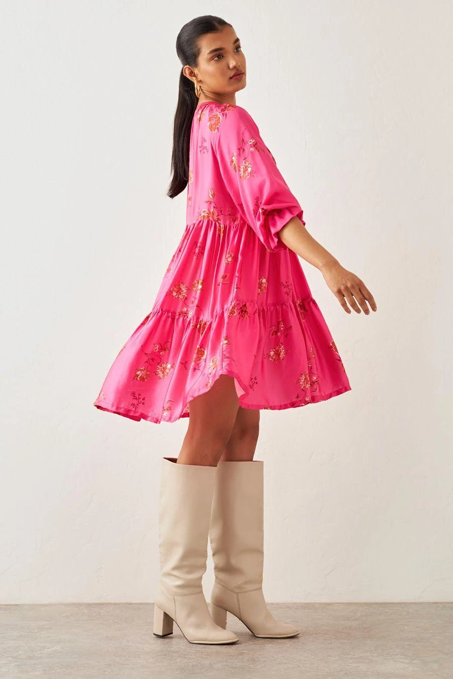 From your work desk to the brunch table & from lounging at home to catching flights, you can always count on this dress. Crafted in bemberg satin, this tiered dress comes with flared hem and an elasticated sleeve detail, in an abstract print.
