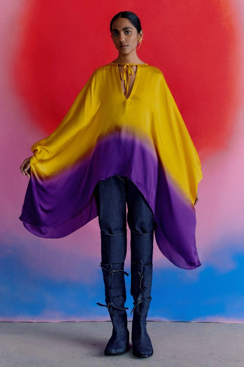 This leheriya bell sleeved top is consciously crafted in luxe vegan silk, making it trans-seasonal & a statement piece. It is made in a striking palette in an ombre design with a high-low hem. This trend-setting piece can be styled in different ways.