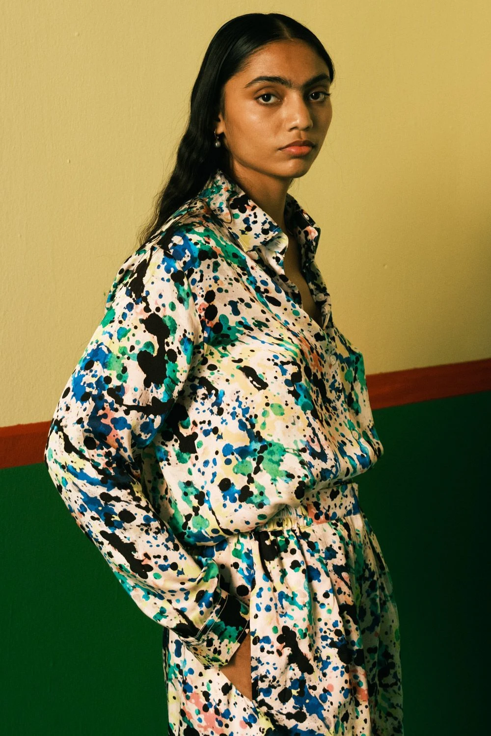The elevated essentials of Studio Rigu, like this printed shirt, are must-haves for the season. It is consciously made in vegan silk with splatter print, making it one of a kind. You can team it up with coordinating shorts from the collection.