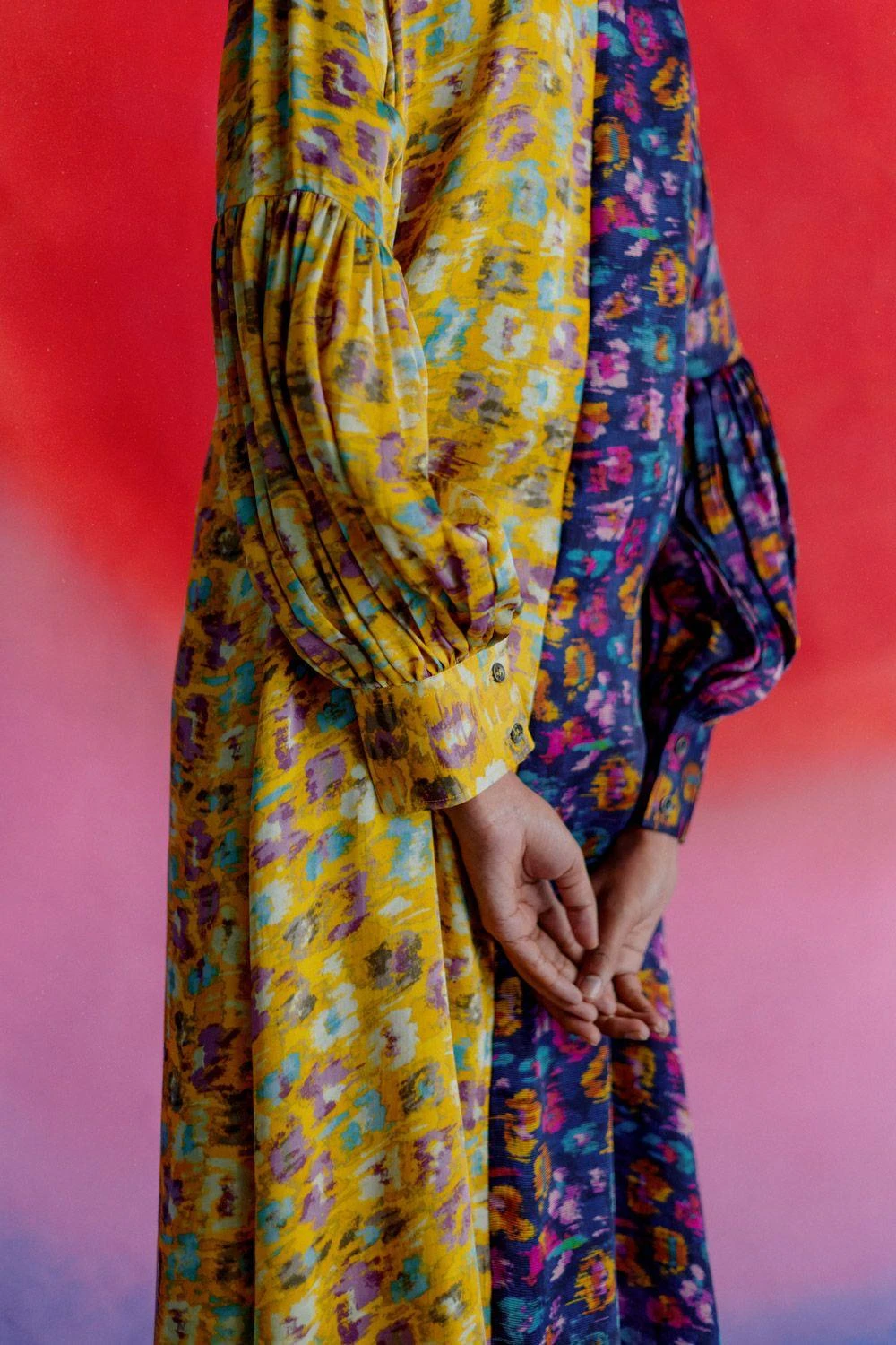 This warlow half & half shirt dress is crafted in digitally printed vegan silk. The eclectic print resembles an abstract painting, making it a trend setting piece. The knots on the front placket adds an interesting element to this look.