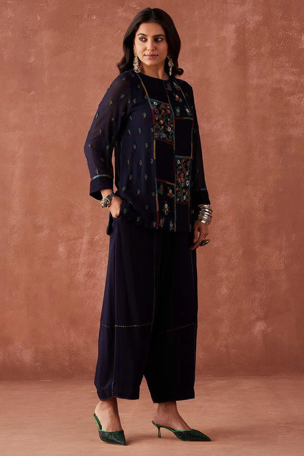 These wide-legged cowl ijar complete with a drawstring and an elasticated band at the back for a comfortable fit, are crafted with embroidered stitches along the side seam.