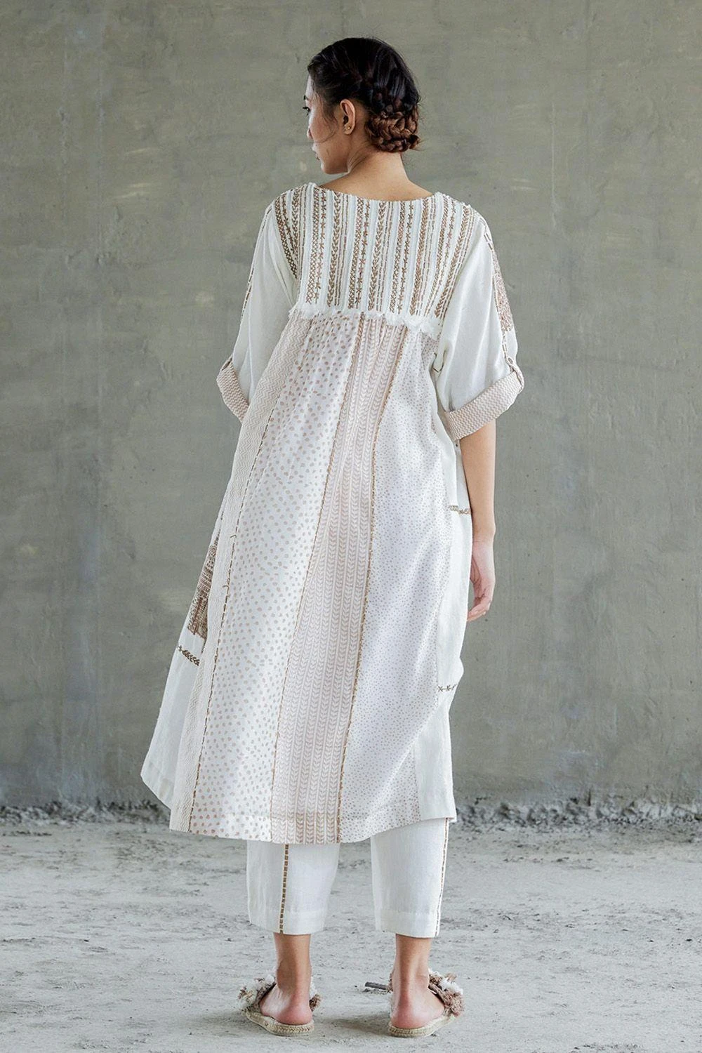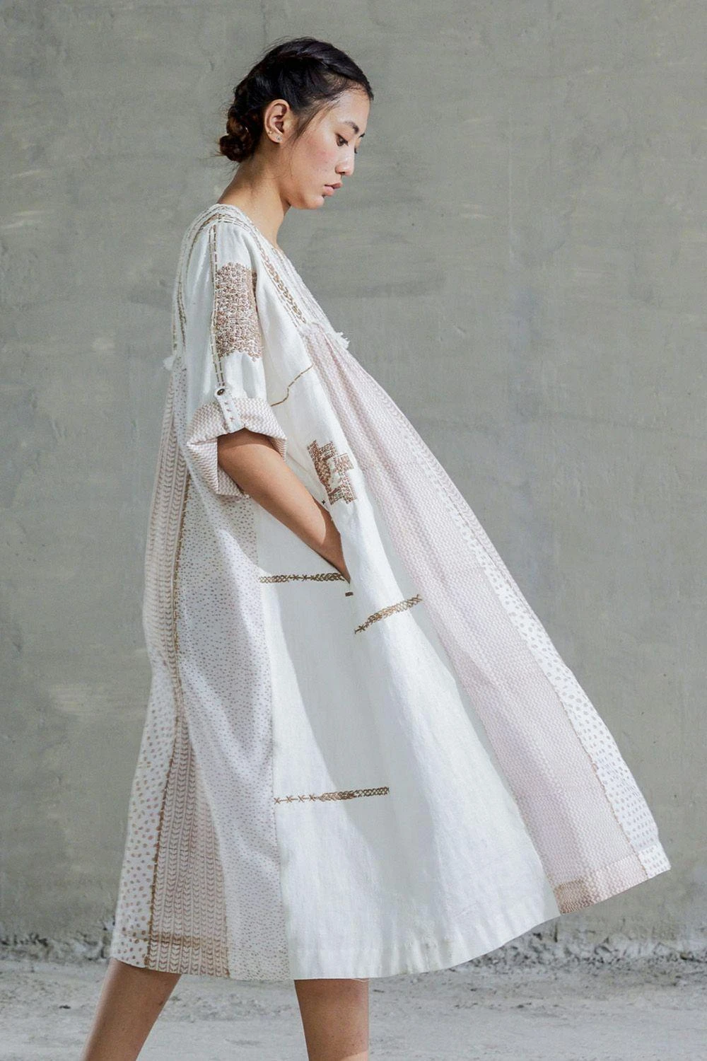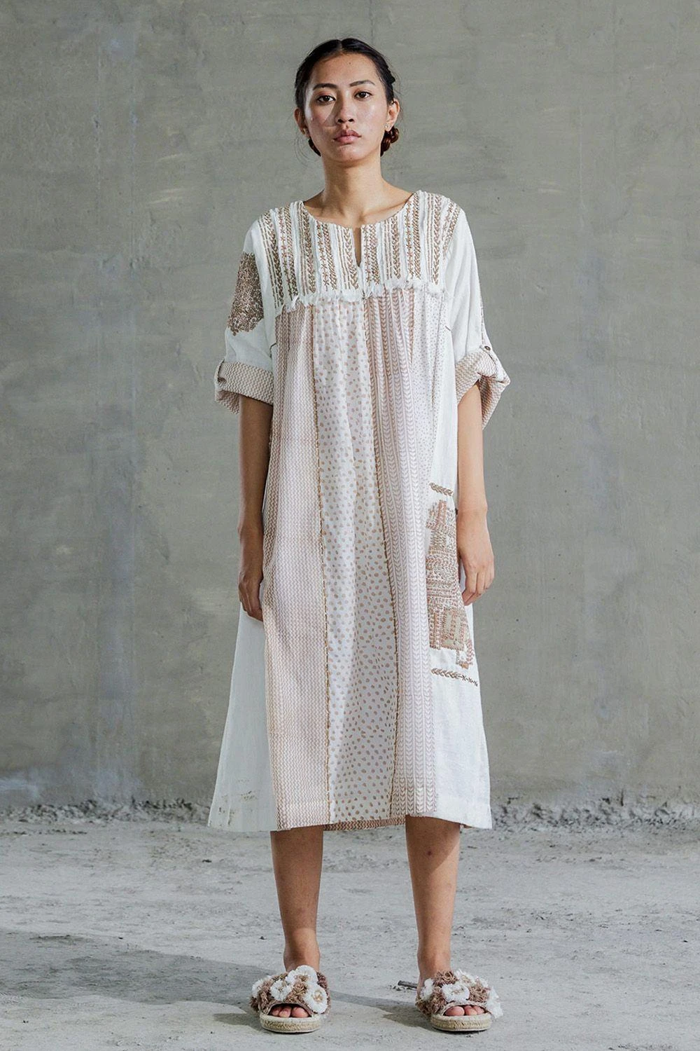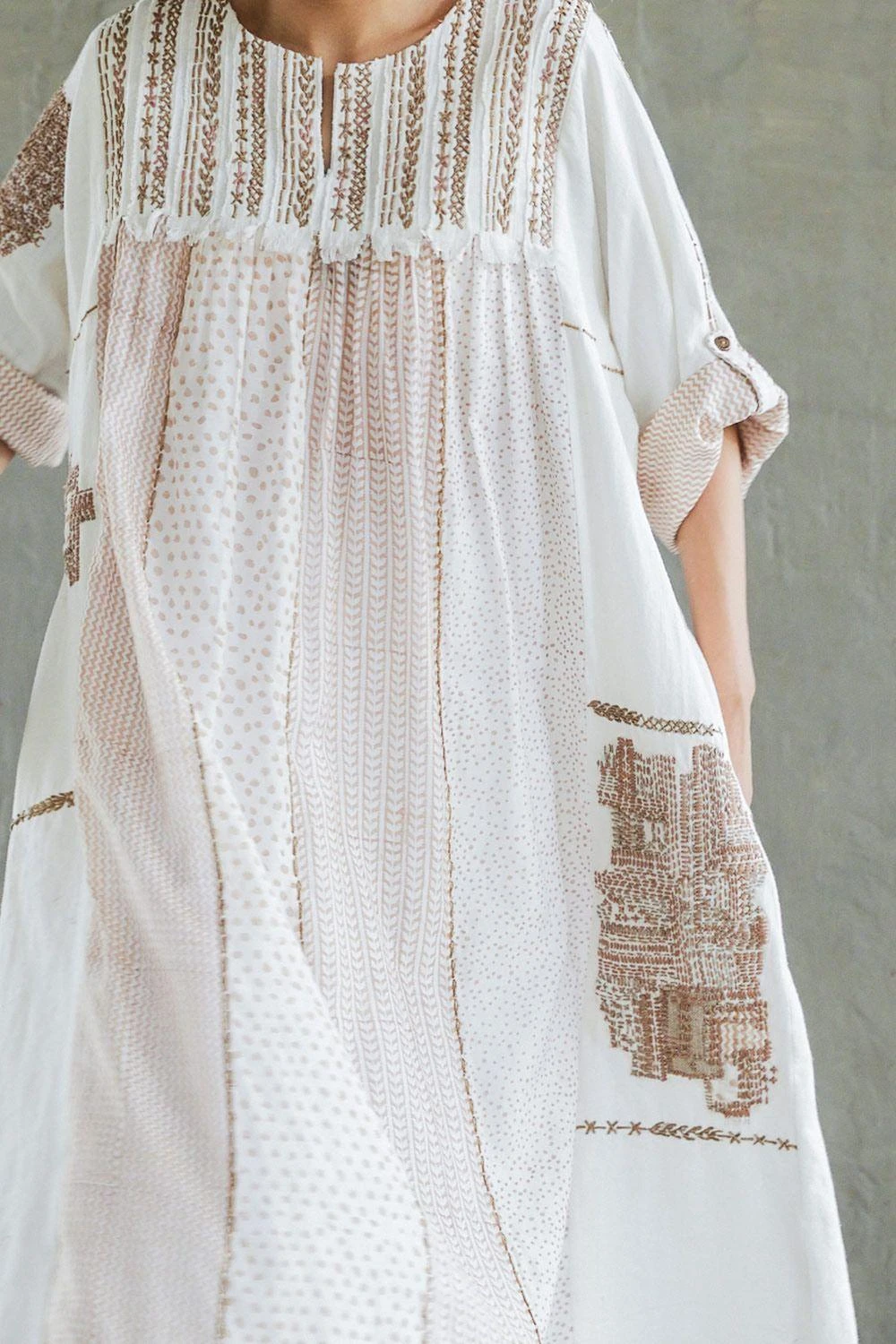 The tab detail and side seam pockets on this tan brown dress with kimono style roll up sleeves are fashioned with juxta positioning of handspun cotton and hand-block printed chanderi. The outfit features boro patchwork and sashiko stitch details.