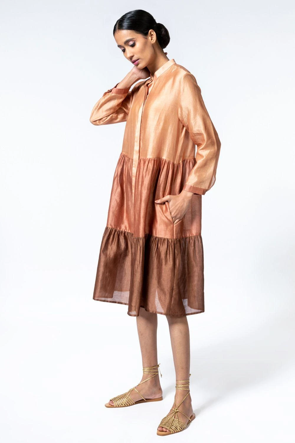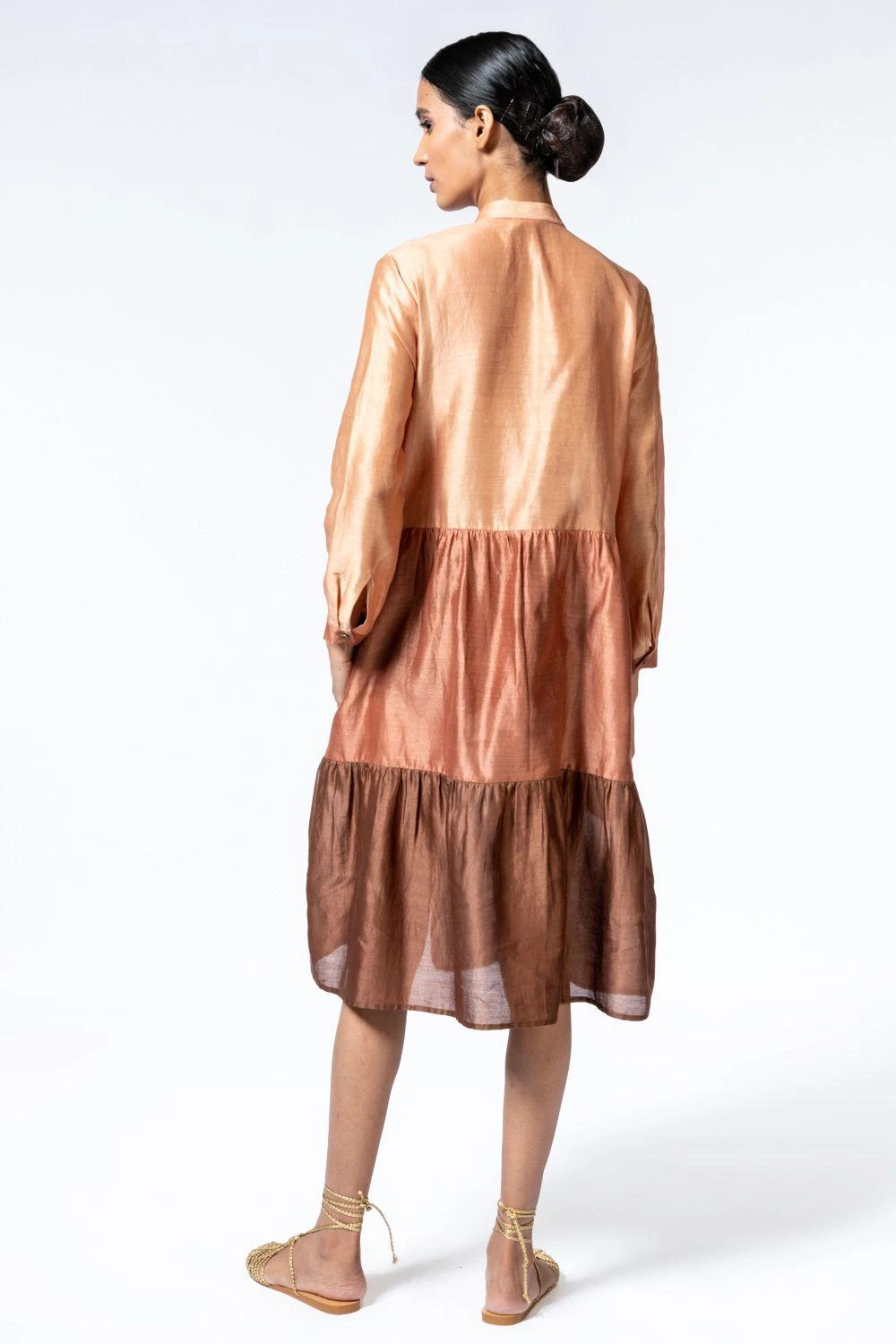 Minimal & opulent this colour blocked tiered dress is a great piece for an elevated style. It is cut in luxe silk with colour blocking detail and concealed placket. Style this look with a pair of statement earrings for an elevated look.
