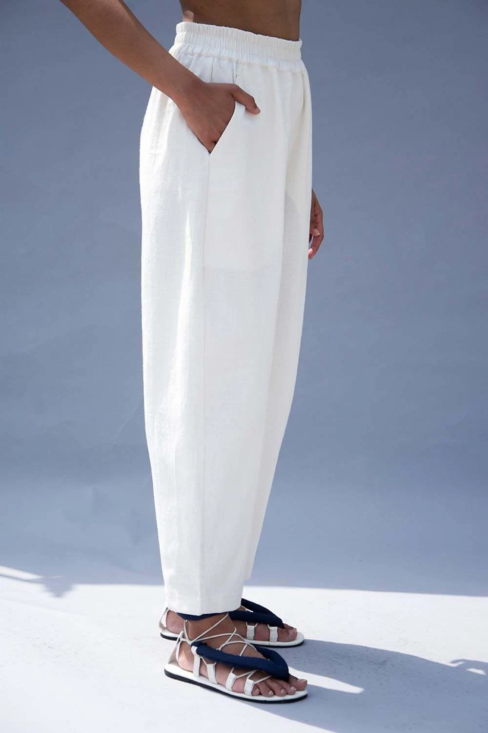 These voluminous relaxed pants are crafted in 100% hand woven yarn-dyed mulberry silk in an elegant ivory palette. It is tailored with side pockets. Pair it with a printed shirt or top to complete the look.