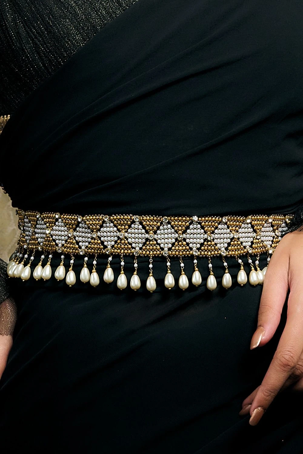 Embrace the allure of artisan craftsmanship with this handcrafted poth beads mesh belt. Its intricate design weaves a tapestry of elegance, while the adjustable chain ensures a perfect fit. The TT drop charm adds a captivating touch.
