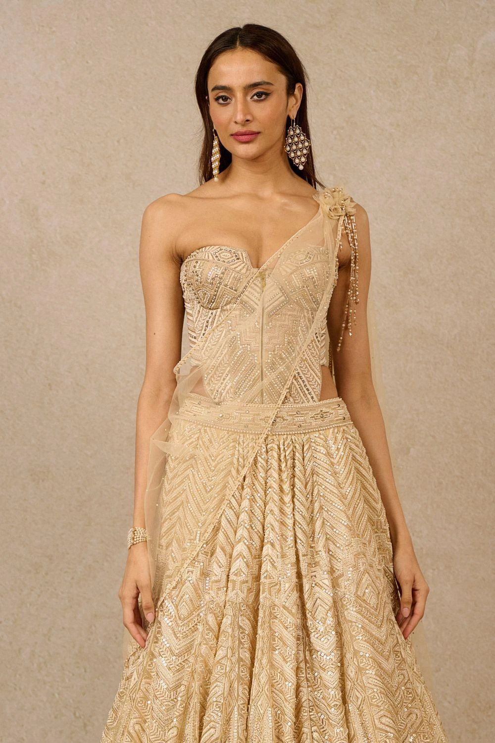 Adorned with exquisite Art Deco panels, this embroidered lehenga is a masterpiece. The sequins and cutdana work add a touch of opulence. Paired with a complementary embroidered corset for a glamorous ensemble.