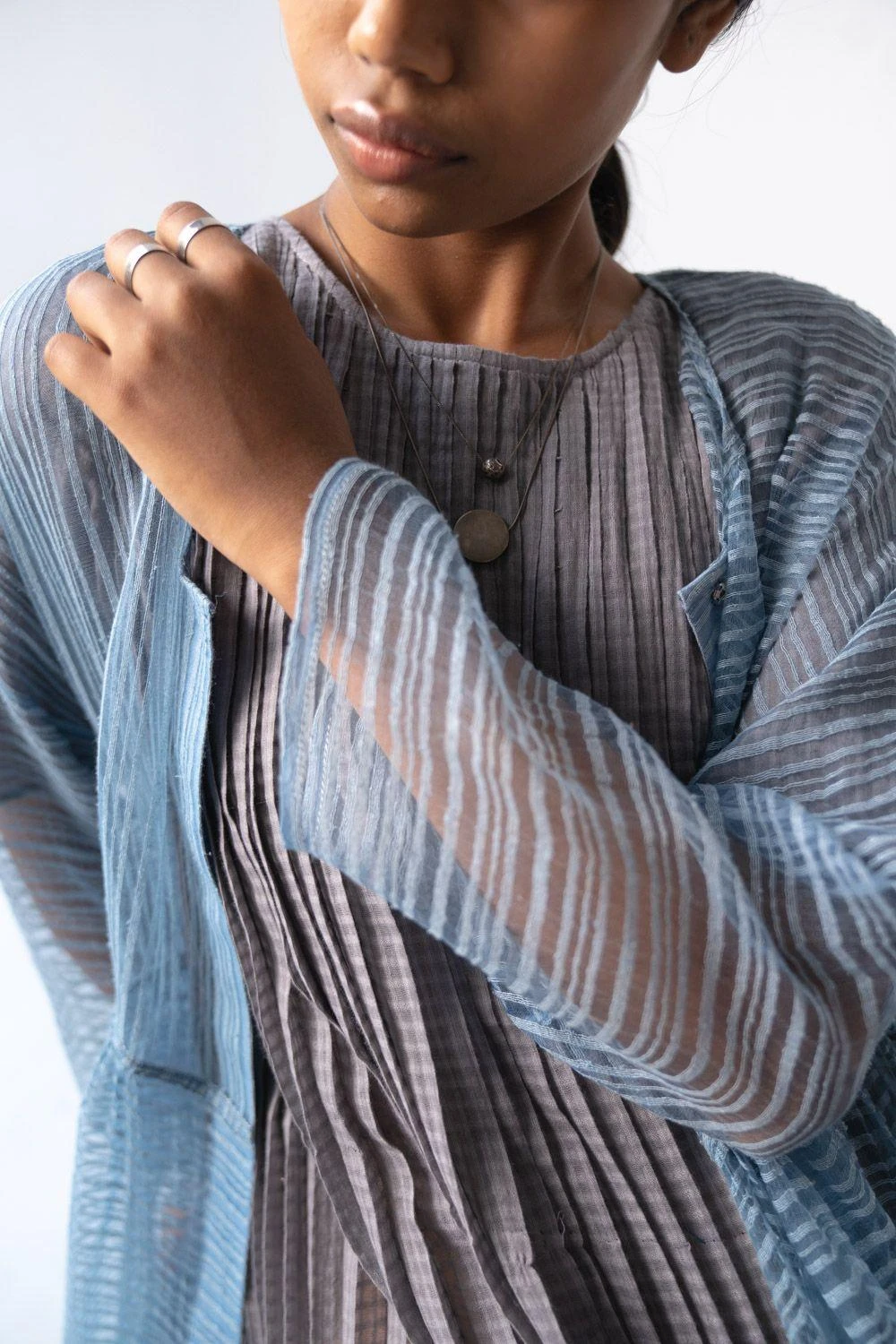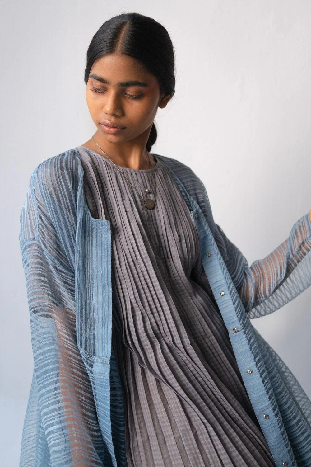 Your contemporary closet surely needs an understated & versatile piece like this. This grey cotton dress is highlighted with hand block printing & kanta details on the micro pleating. You can style this subtle piece with a long neckpiece.
