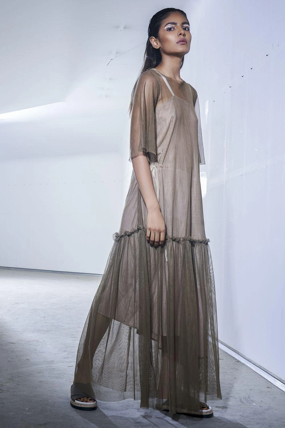 This gossamer olive green dress is our definition of modern contemporary. Look for the playful tiered panel! Can be worn over a slip, a chiffon dress or even on a tee & denim , it will get you a unique look every time.