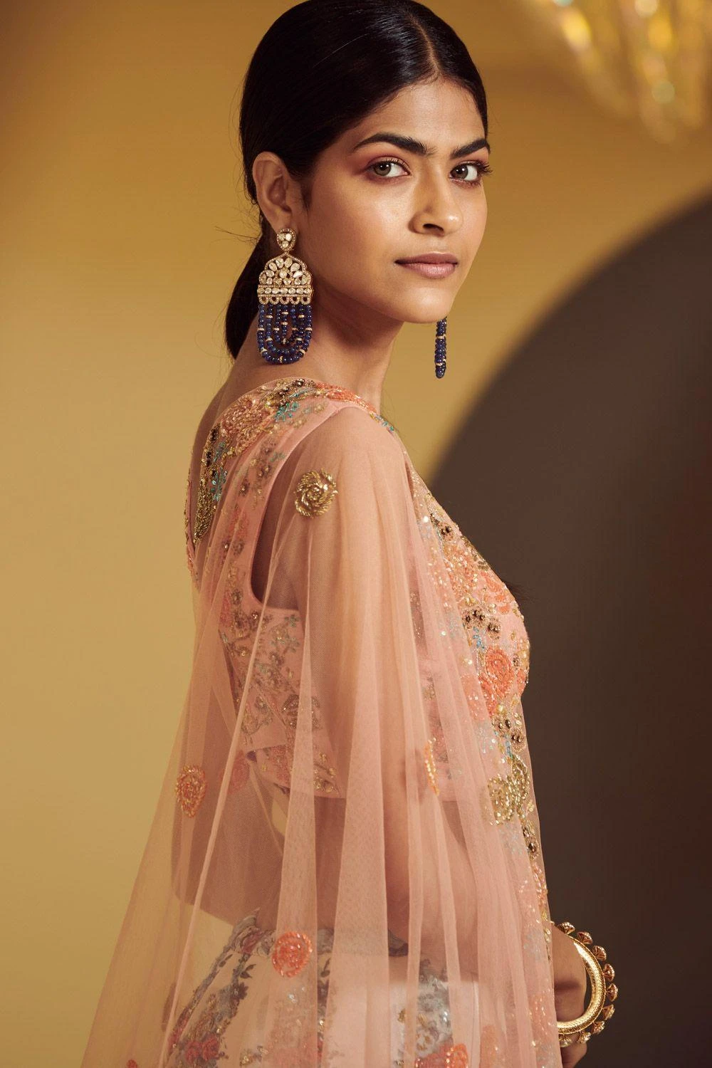 This stylish digital printed 16 kali lehenga is perfect for summer wedding festivities. The set is adorned with floral resham embroidery & heavy pearl, sequins & cutdana embellishments.