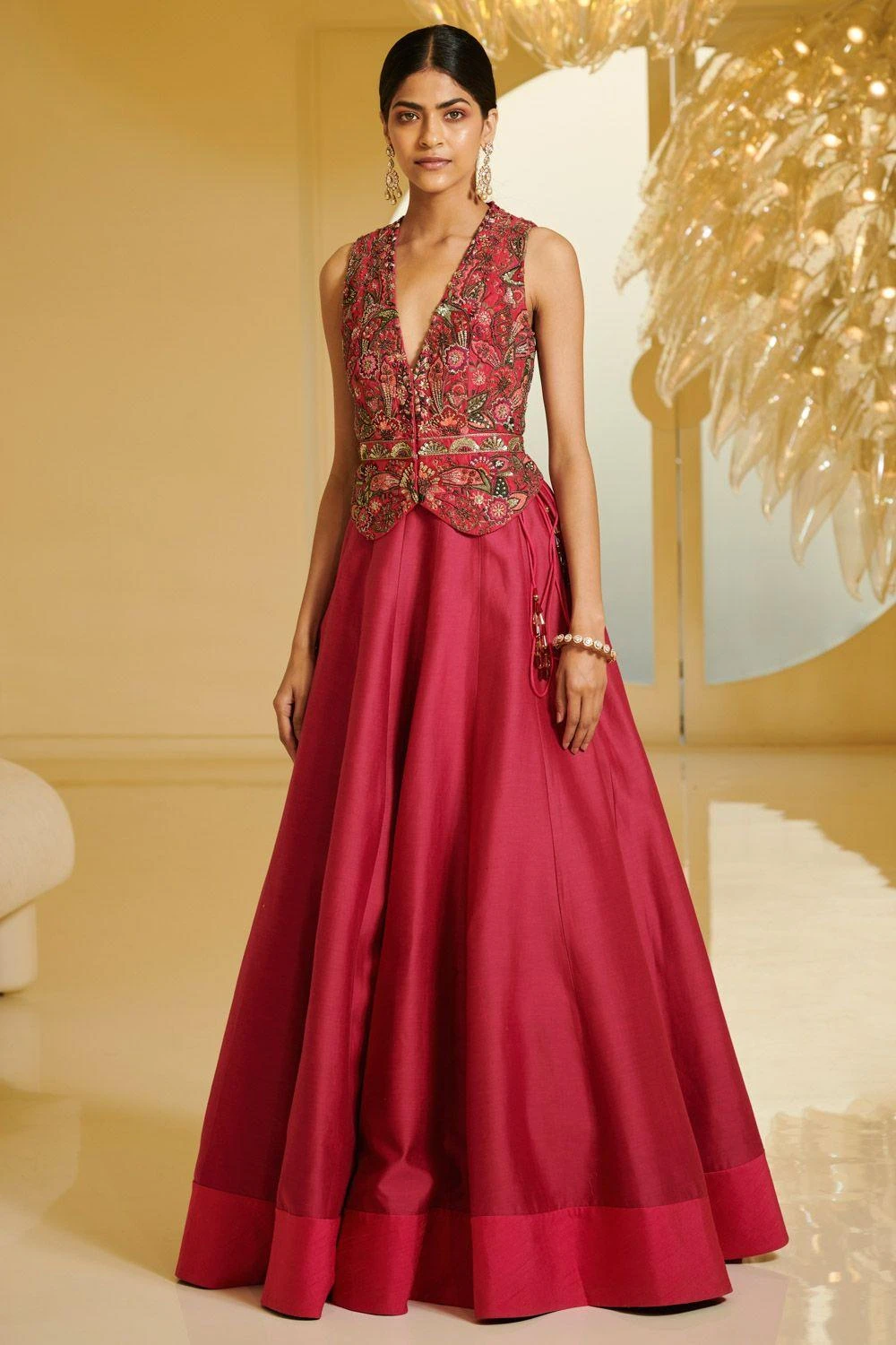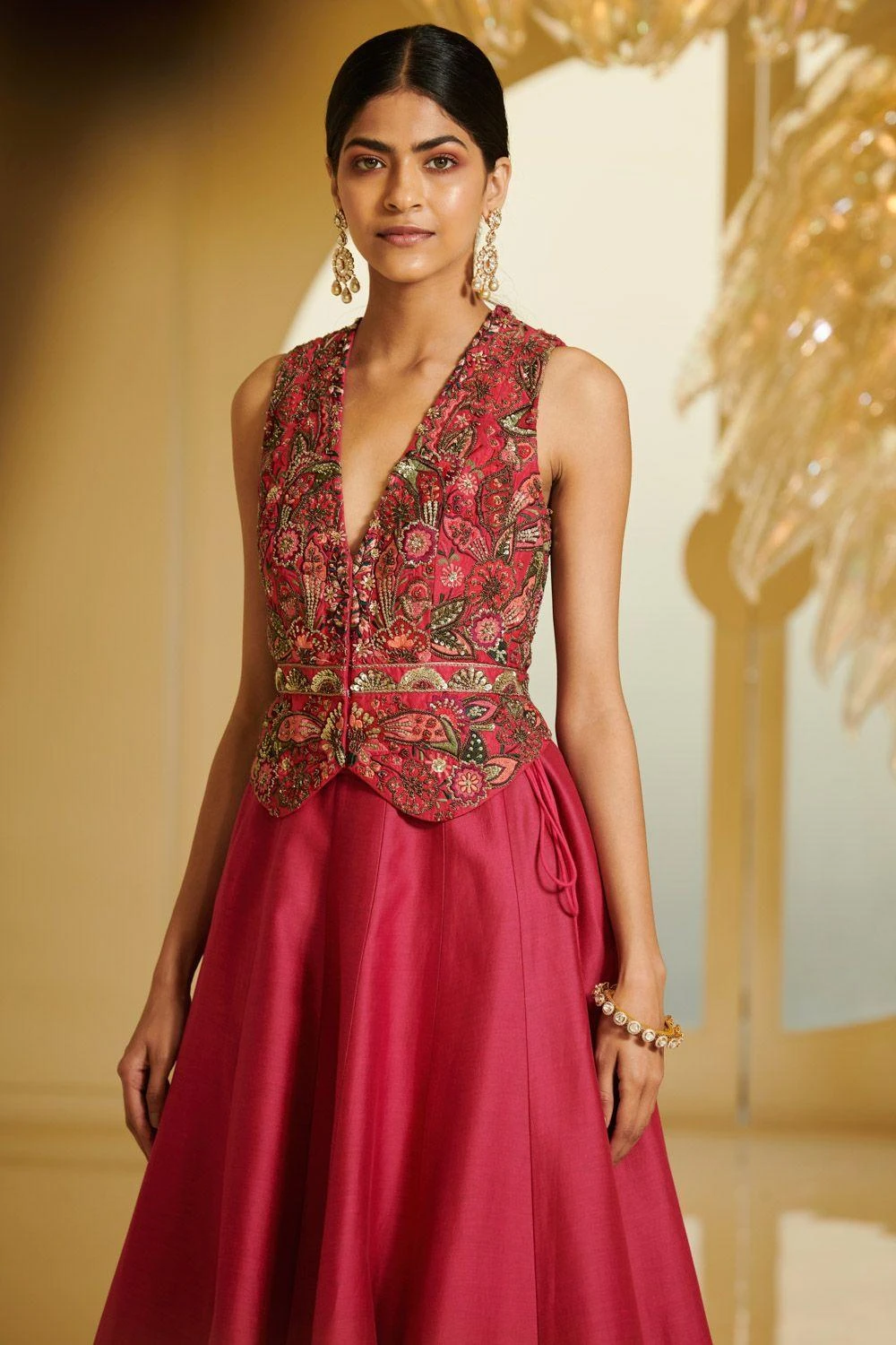 This elegant fuchsia pink lehenga comes with a fully embroidered vest. The vest is embroidered with resham thread embroidery & embellished with pearls, sequins & cutdana details.