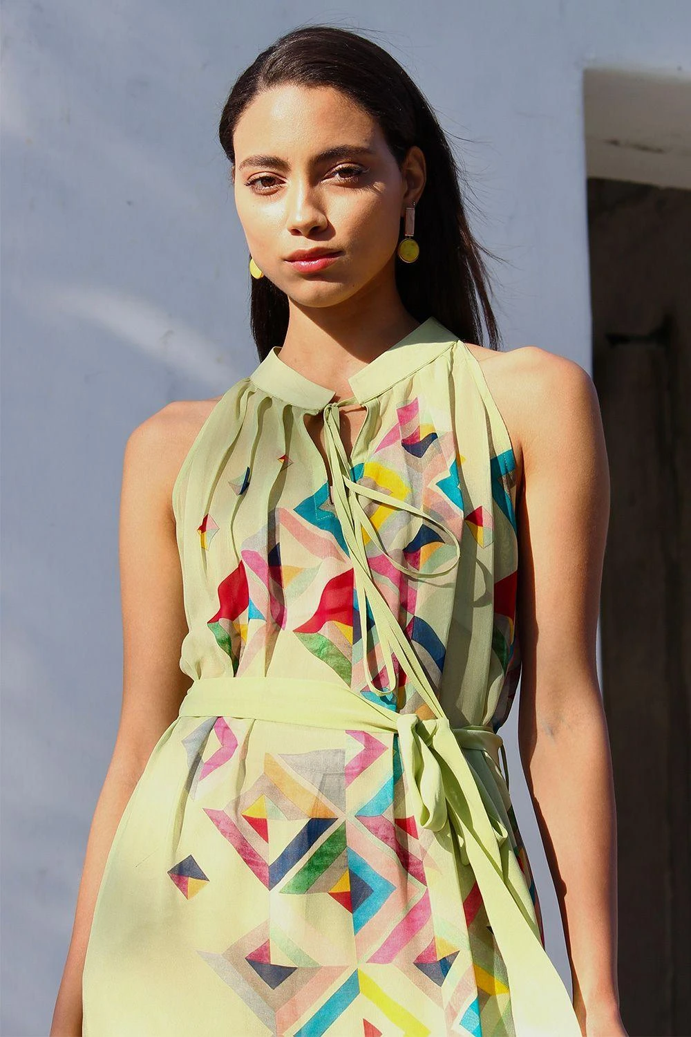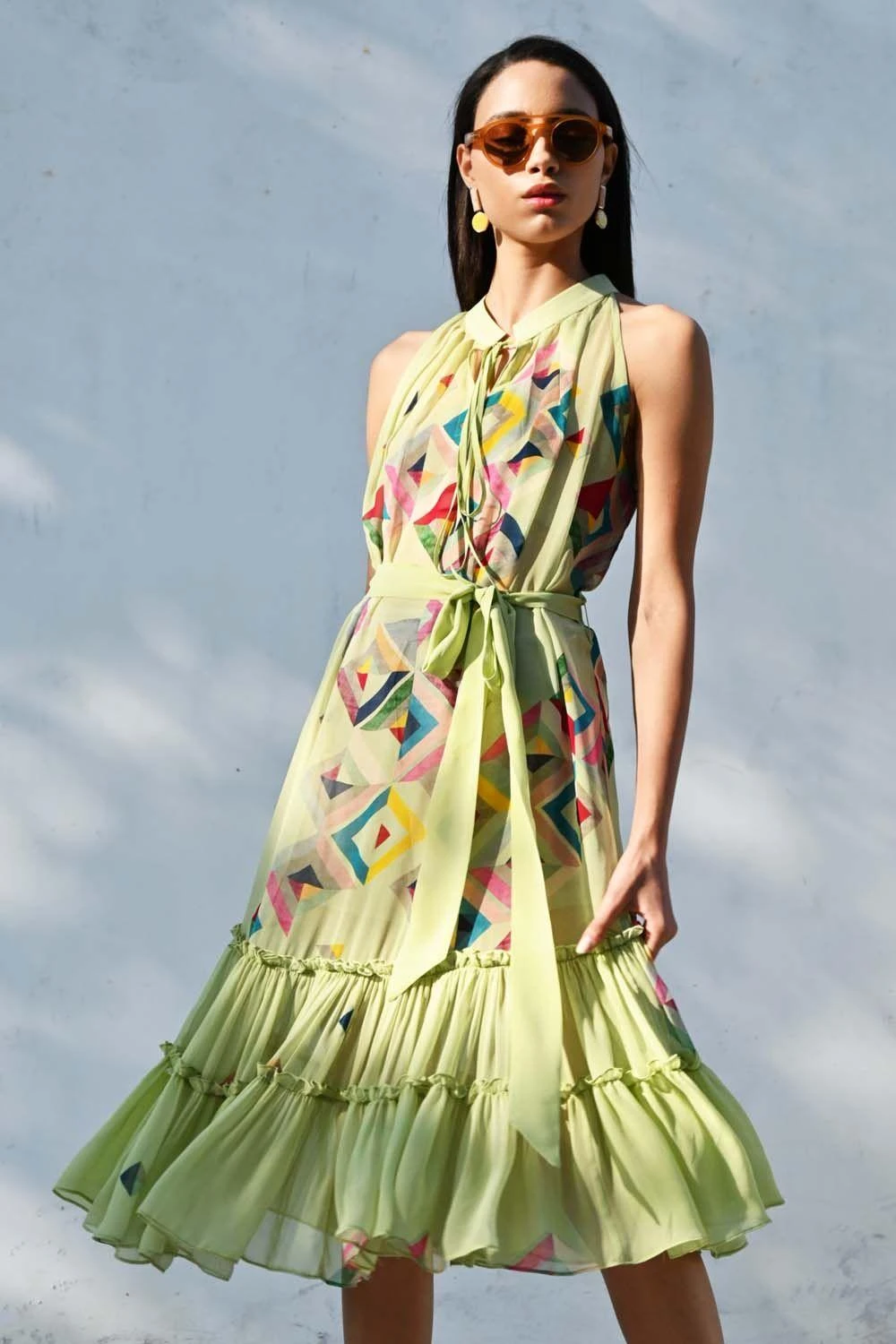 This color block printed green ruffle dress tastes like summer. It is cut georgette and enhanced with ruffles & gathers detailing. Style this piece with a pair of quirky earrings and a pair of strappy heels.