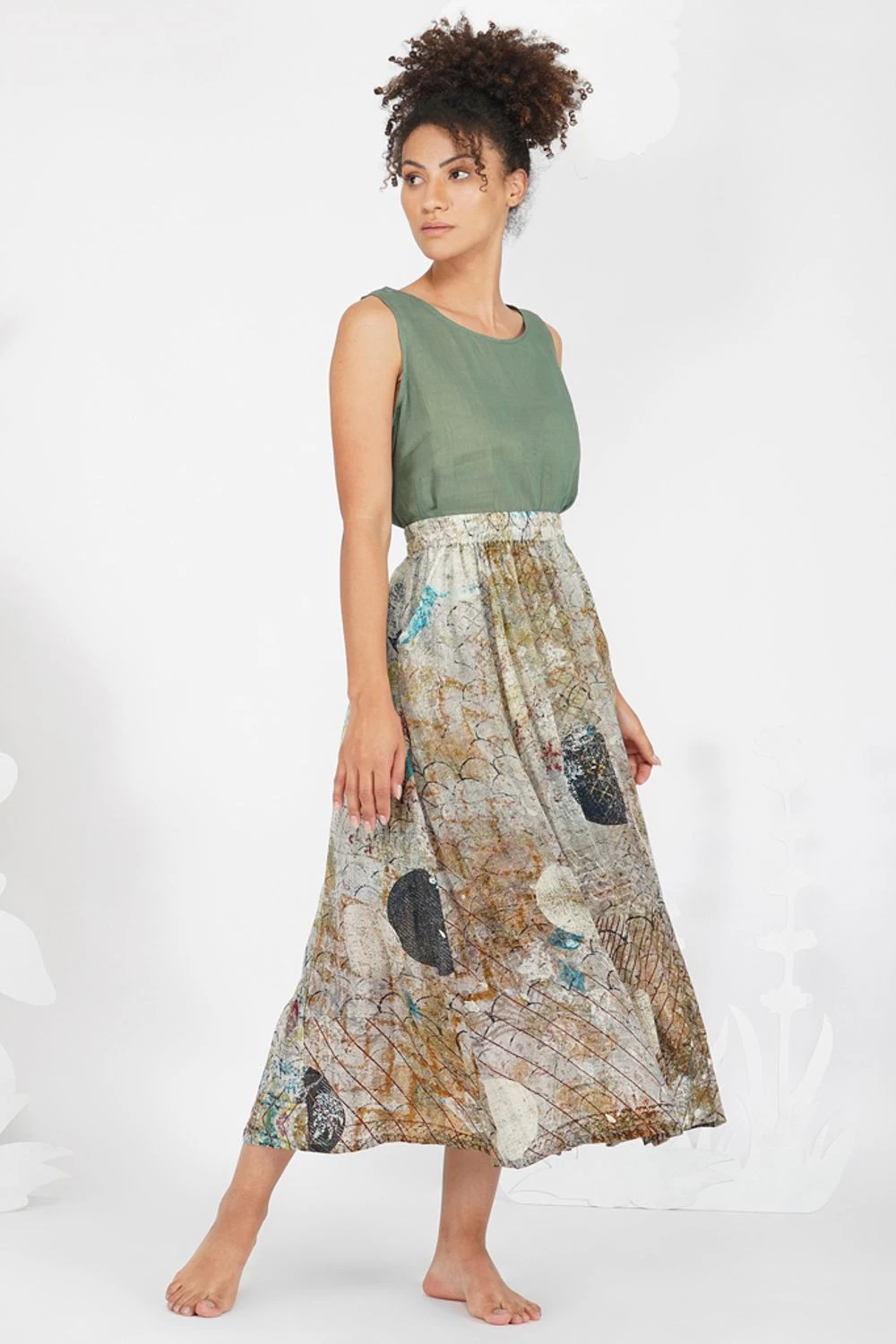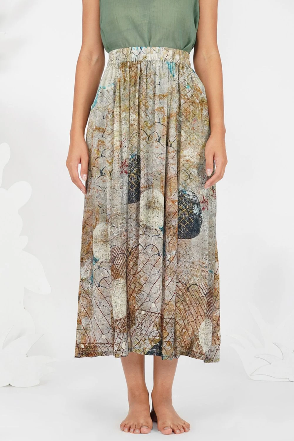 Embrace an artsy look in this abstract grey skirt. It is cut in crepe viscose and features geometrical impressionist brush strokes in brown, black, white & olive, painted layer over layer to create captivating compostions on this flowy silhouette.